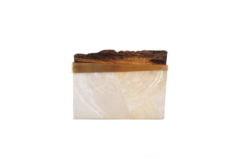 Tilted square-shaped minaudière made of White Abalone shell. Accentuated with battered Robles wood and a gold plated metal strip on top.