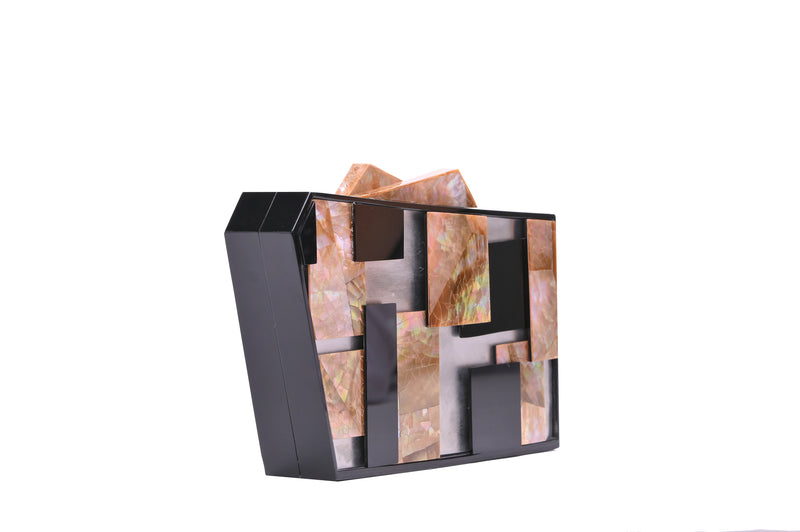 Art Deco box clutch bag in 3D embossed, multi media with mix layered of White Kabibe Shell, Brown-lip shell and Black Resin. All handmade achieving the organic raw artsy perfection just right for the palm of your hand.