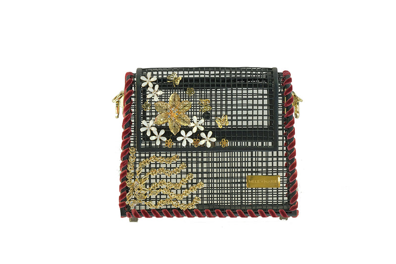 Classic skirt shape cage shoulder bag. Metal strips are braided and welded together. It is finished with classic baked black paint and embellish with metal closure. Finish curating with enamelled flowers and metal ornaments.