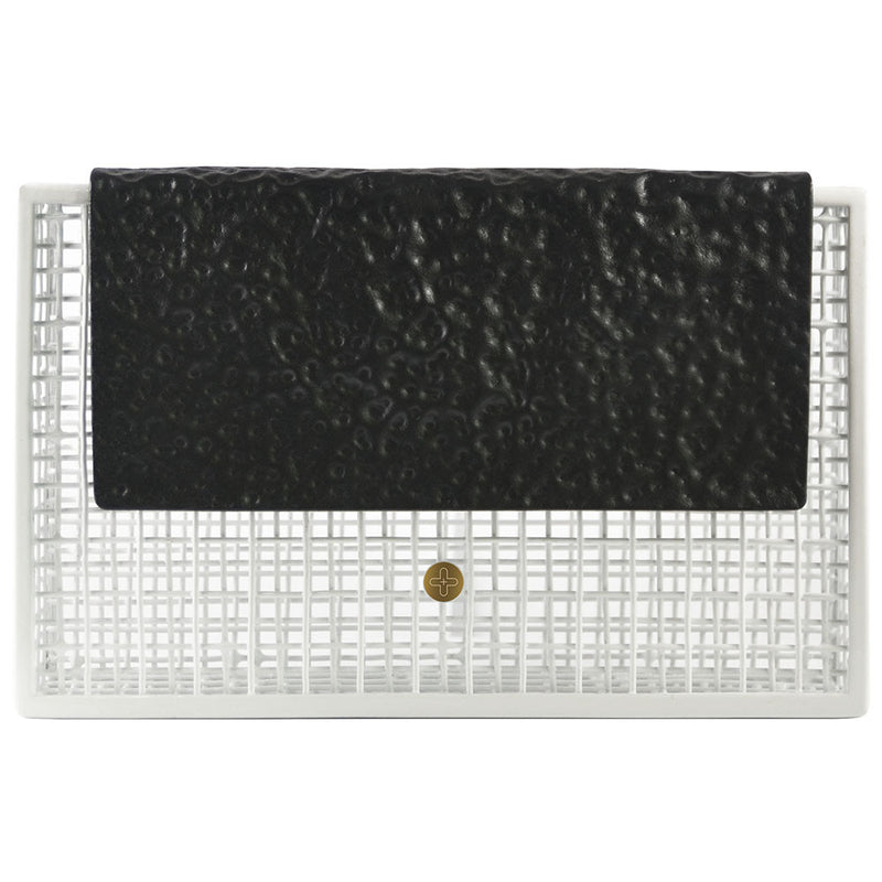 Box shape CAGE minaudière from our freedom collection. Metals strips are braided, welded in high temperature and coloured baked black and white finish . This clutch is accentuated with flap battered metal texture as top closure. All handmade achieving the artsy feeling for your classy brave daily styling activities.