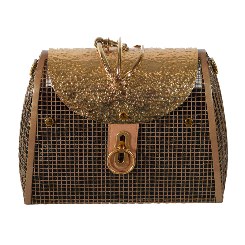 Huge Skirt shape cage hand bag. Metal strips are braided and welded together. It is finished with classic gold plated mesh wire, hammered brass metal sheet cover with leather and metal lock