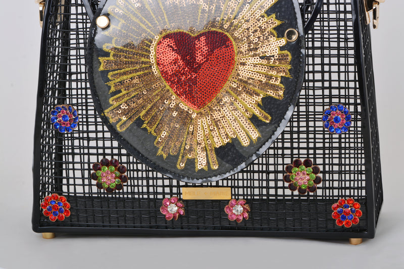 Classic skirt shape cage hand bag. Metal strips are braided and welded together. It is finished with classic baked black paint and embellish with statement heart patch and final touch of leather and metal closure.