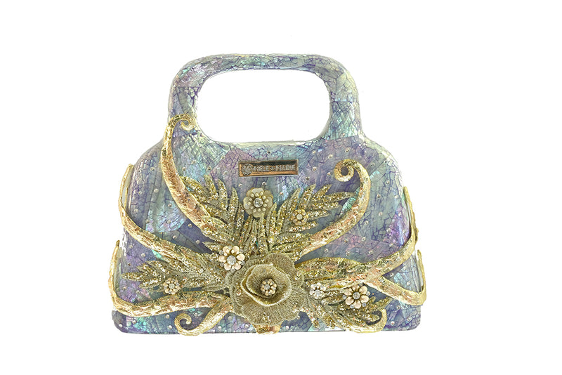 The Hannah Emilia is made of purple abalone and embellished bravely with small crystals. It is then designed with a 24 karat gold plated vine design and a gold lace bedecked with pink flowers.